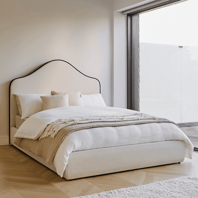 Think about the style of the bed, if you have a dark velvet bed then consider adding patterned bedding to match the velvet hue or introduce furniture with gold details and a pretty glass lamp for the bedside. An upholstered bed in soft boucle, sets the tone for a calm and neutral bedroom. Add interest with textured throws and cushions and a natural wooden mirror to reflect light and add a spacious feel.