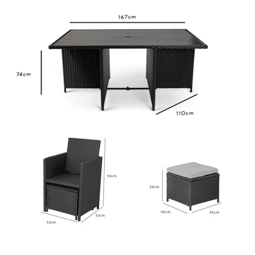 Ideal for summer gatherings with family and friends, this versatile outdoor rattan dining set allows for sit-down BBQs and alfresco dining.