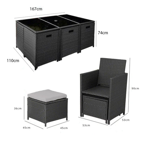 • What's included - Rectangular glass table, 6 rattan chairs with cushions and 4 rattan stools with cushions.