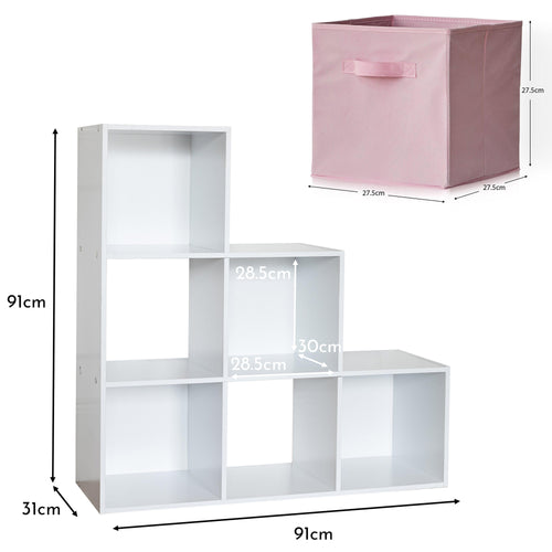 - Set Includes - Ladder bookcase with 6 cube compartments and 3 pink fabric boxes.