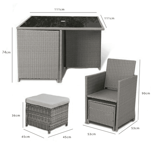 - 1 x glass-topped square dining table with parasol hole Premium cushions in grey