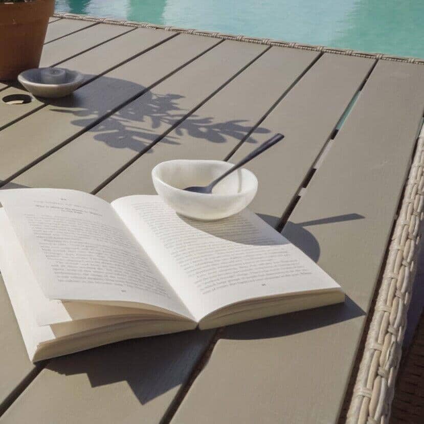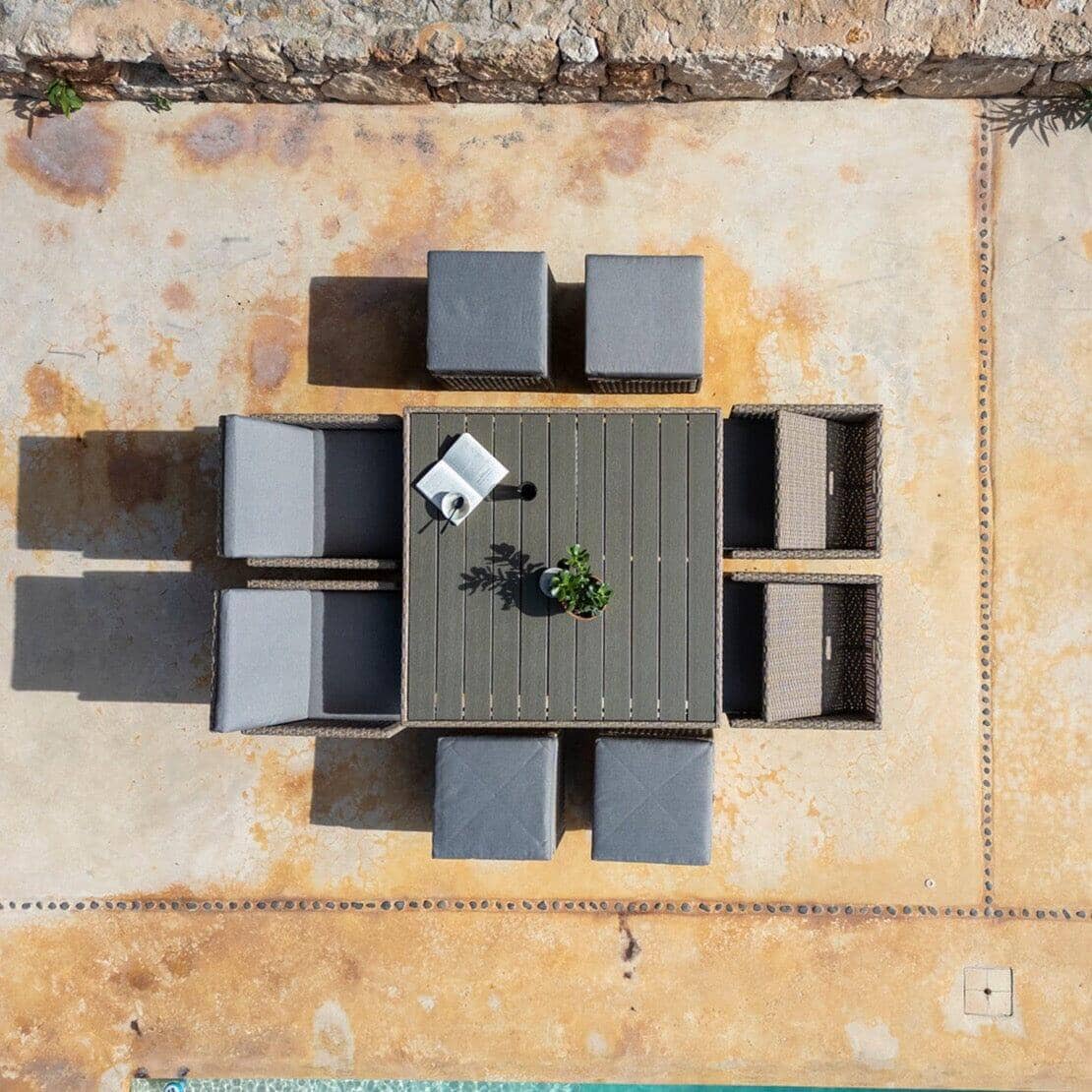 The 8 seater cube dining set showcases 4 rattan chairs and 4 rattan footstools as well as a square parasol in cream, all complemented by a polywood tabletop in a warm natural brown hue. This ensemble seamlessly combines style and comfort, providing the perfect setting for outdoor dining and relaxation.