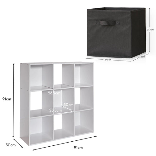 9 Cube Storage Unit - Chalk White Bookcase with Black Boxes