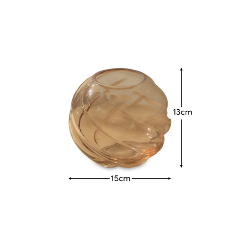 The Adria round glass vase is finished in champagne coloured glass with a beautiful textured swirl design. This decorative vase is the perfect way to elevate a bookshelf or sideboard in a dining or living space and the champagne hue gives this vase an elegant look.