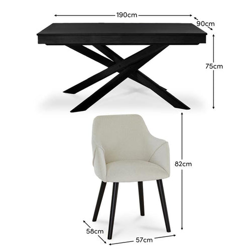 • Design Features - Amelia black dining table with crossover legs and 6 Freya armchairs in ecru boucle.