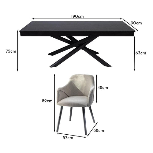 Step into modern dining comfort with the Amelia dining room set from Laura James. A sleek black defined edge dining table, with a unique intricately designed leg structure, combined with the contemporary Freya sand armchairs, which create a warm and inviting dining experience.
