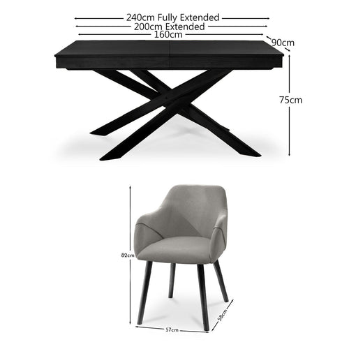 The Amelia black oak extending dining table features a solid oak veneer tabletop and rubberwood cross over legs. This rectangular table can seat up to 10 people when extended. The set comes with 6 Freya armchairs finished in a fossil grey with comfy armrests and contemporary black legs.