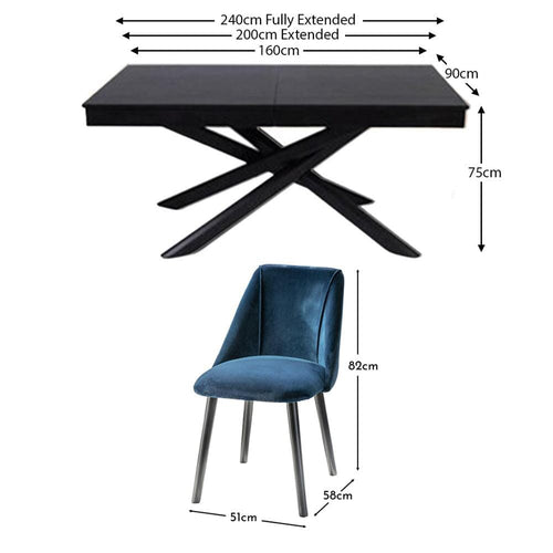 Amelia Black Extendable Dining Table Set - 6 Seater - Freya Blue Dining Chairs With Black Legs - Laura James