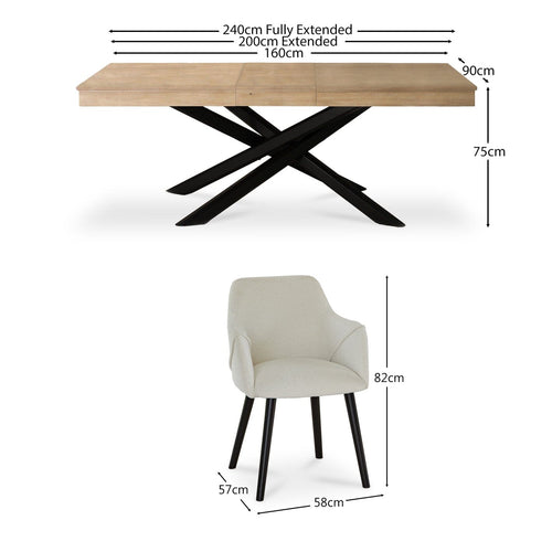 Elevate your dining space with the Amelia and Freya dining set. The Amelia extending dining table features a whitewash oak veneer tabletop and black rubberwood legs in an elegant cross over design. Once extended the table can seat 8 to 10 people, ideal for those to enjoy entertaining. The set is complete with 6 stylish Freya armchairs each finished in a soft neutral boucle fabric with contrasting black legs.