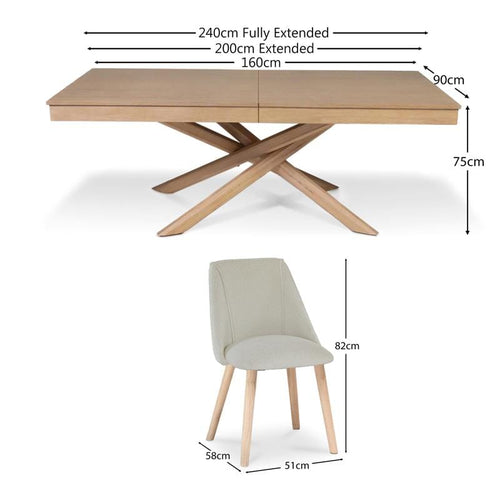 The Amelia and Freya dining set includes the Amelia whitewash table which features a whitewash oak veneer tabletop and rubberwood cross over legs and can extend to seat up to 10 guests. This rectangular table comes with 6 Freya dining chairs each upholstered in ecru boucle fabric, with whitewash oak legs.