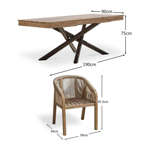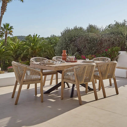 The Amelia and Nala outdoor dining set offers an elegant contemporary look with statement design elements like the entwined Amelia table legs and Nala rope combined with light brushed acacia wood. This set is perfect for family gatherings, from summer lunches to barbeques and evening cocktails.