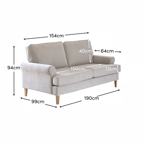 The Annabelle sofa brings traditional charm to your living space, featuring a deep sprung base and a cushioned backrest. Designed with comfort in mind, this sofa invites you to sink in while maintaining a sense of timeless elegance. The piped curved armrests and cushions, paired with the pale oak legs contribute to its refined classic appearance. Perfectly proportioned, this medium-sized sofa comfortably accommodates three guests, providing ample space for lounging with family and friends. Personalise your sofa with scatter cushions and throws to add personality and style to your living space. To complete the look, pair with the Annabelle corner sofa to create a classic palette of cream and warming neutrals that instantly elevate your home. Compliment with materials like brass, textured boucle and white-wash wood for a calming finish.