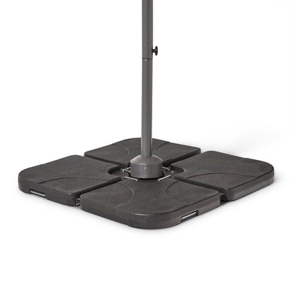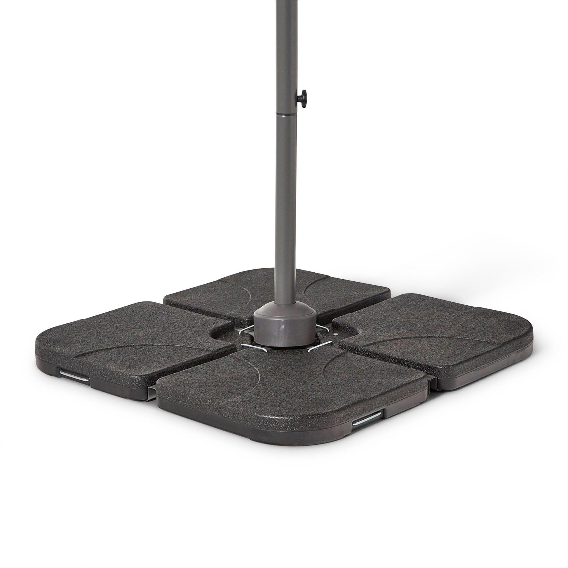 • Parasol BaseQuartered base made from durable plastic - can be filled with water or sand resulting in an approximate 60kg or 80kg weight so you can be confident your parasol is well anchored.