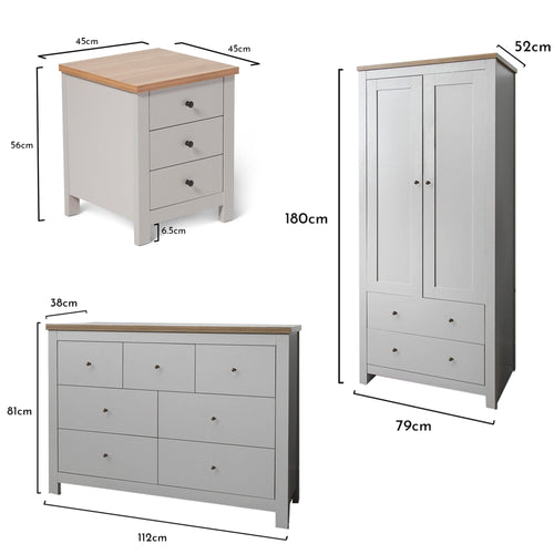 Discover the Bampton bedroom furniture 4 piece set in Stone Grey - a stunning collection that blends classic sophistication with modern practicality. The focal point of the set is the Grey Double Wardrobe, featuring ample hanging space and contemporary detailing. Accompanying the wardrobe is the Chest of 7 Drawers, offering versatile storage options. The set is completed with two 3 Drawers White Bedside Tables, providing symmetry and convenience for your nighttime essentials.