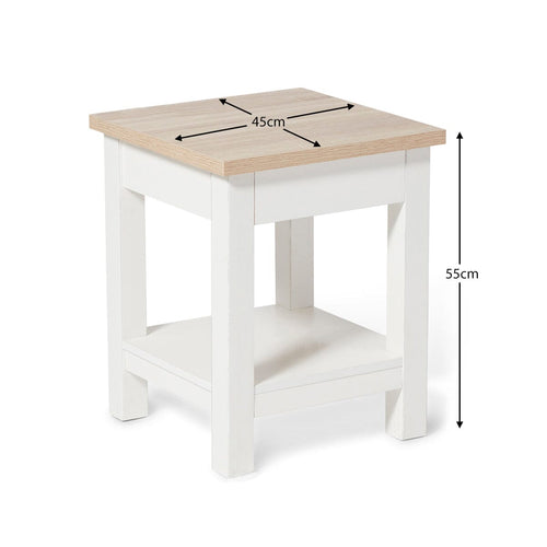 The Bampton square side table from Laura James features a beautiful oak effect tabletop and has a shelf at the bottom. Finished in a contemporary shade of alabaster white this side table is perfect for any corner of the home.