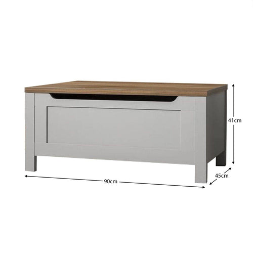 With a soft stone grey finish and solid oak effect top the Bampton blanket box has an air of modern country chic.