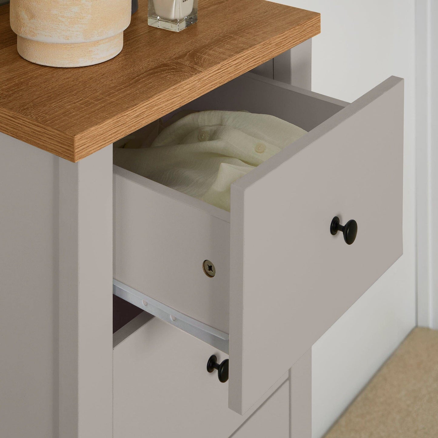 Wherever you put it, it will add modern country charm to your home with it's chic stone grey finish, smart handles and oak effect top.