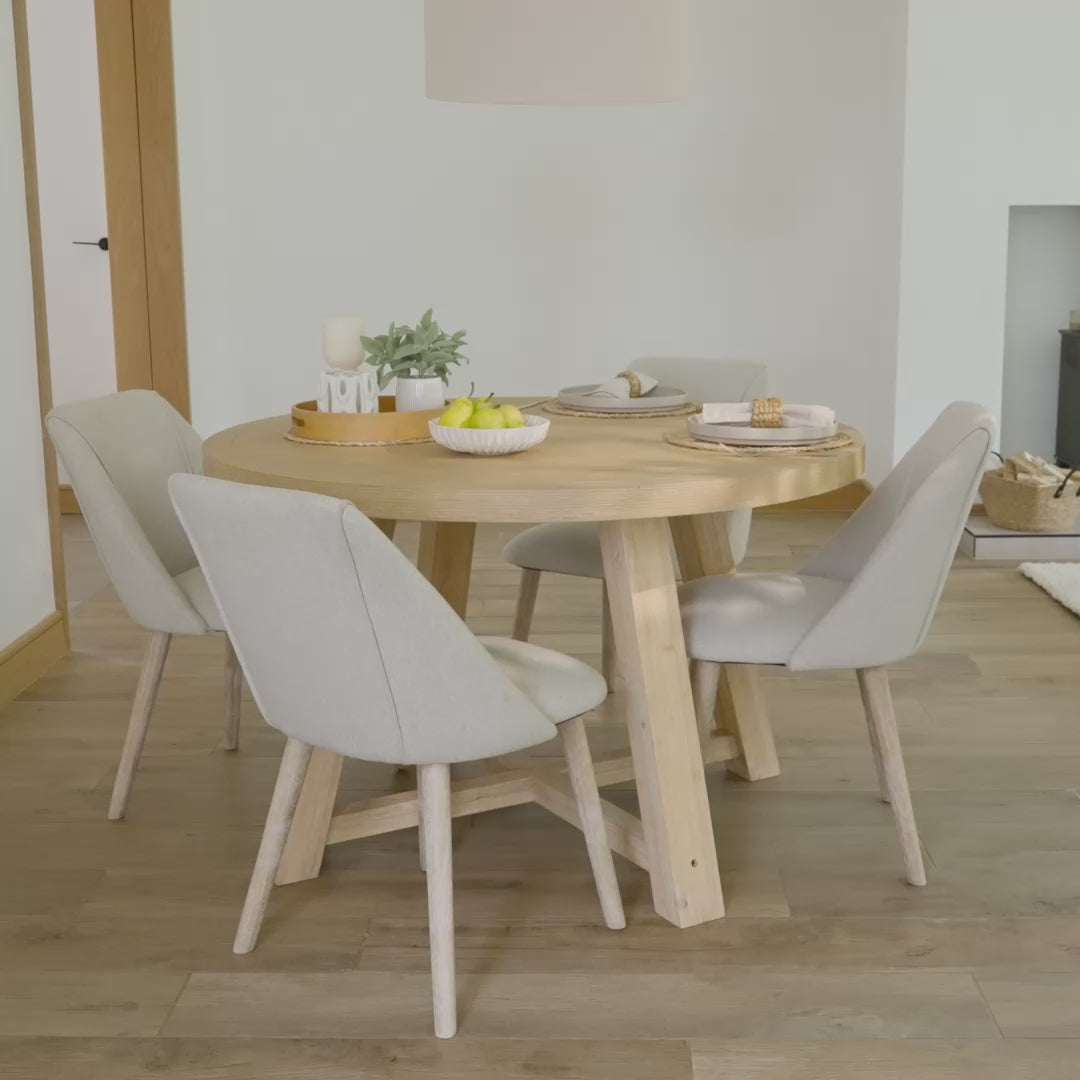 Create a classic and inviting dining space in your home with the Charlotte round dining table, new AW25. The round Charlotte table is ideal for conversation and the sturdy legs and crossover base offer timeless appeal. Finished in whitewash oak, the Charlotte table can be paired with classic wooden dining chairs or neutral upholstered chairs for a classic look.