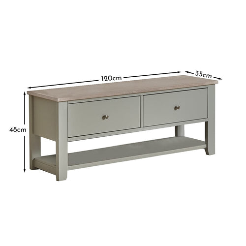 The Chatsworth TV bench is finished in a lovely linen grey hue and features a whitewash oak veneer top. With 2 handy drawers with chrome pull handles, this TV bench also features a shelf underneath for storing a media box or games console.
