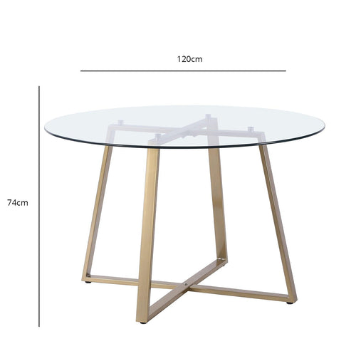 This sleek modern dining table adds a sophisticated style to your dining space. With space to seat four, this round dining table is perfect for creating a social environment in a small space. The Clara dining table features a glass tabletop and gold frame that will add a touch of contemporary chic to your home.