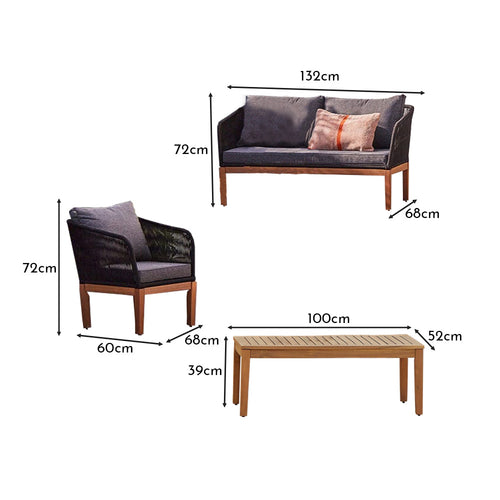 The Eaden rope outdoor conversation set in black features a 2-seater outdoor sofa meticulously crafted with a blend of rope and wood, accompanied by coordinating garden armchairs. Complementing this outdoor ensemble is a wooden coffee table, thoughtfully designed for storing your preferred books and beverages. Tailored for smaller gardens, the Eaden set offers a compact and versatile arrangement that can be easily adjusted to suit both your garden layout and personal preferences.
