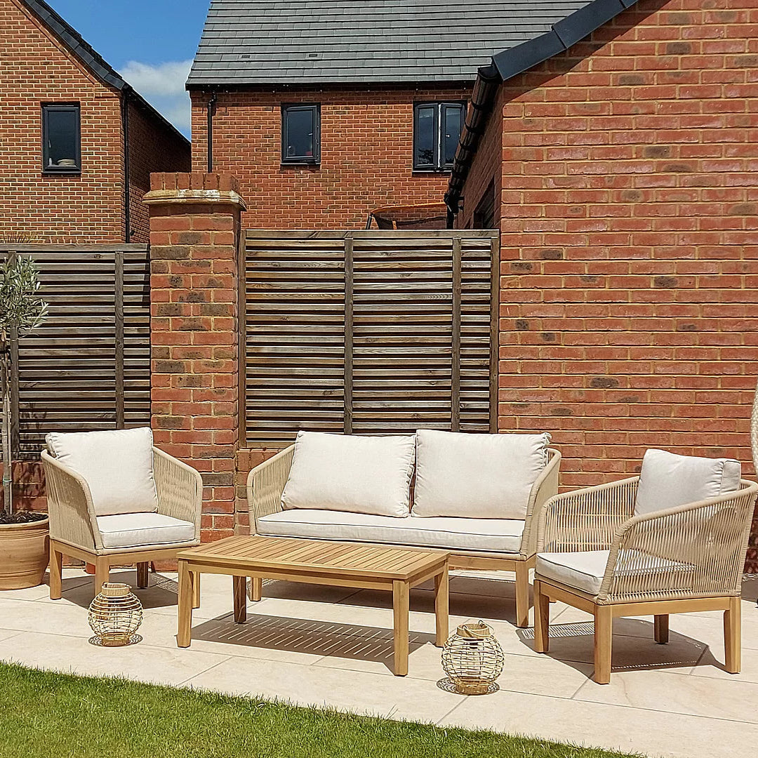 The Eaden garden set is crafted from premium acacia wood with a stylish rope weaved design for added texture and a contemporary look. The set features a 2 seater sofa, 2 armchairs and a matching wooden slatted coffee table. This beautiful natural wooden set is complete with neutral coloured cushions for comfort.