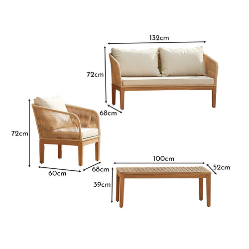 The Eaden garden set is crafted from premium acacia wood with a stylish rope weaved design for added texture and a contemporary look. The set features a 2 seater sofa, 2 armchairs and a matching wooden slatted coffee table. This beautiful natural wooden set is complete with neutral coloured cushions for comfort.