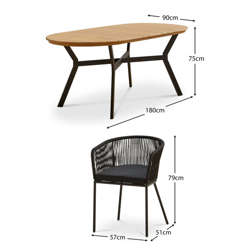Ezra 6 seater oval wooden garden dining set with 6 hali black rope chairs Fabrics