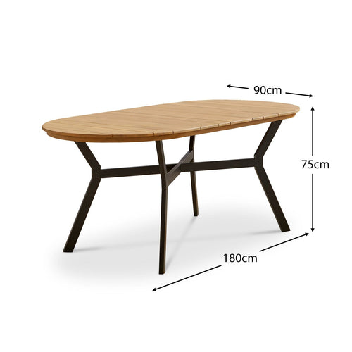 • Design features - Oval white acacia wood slatted tabletop with teak effect finish and black metal legs.
