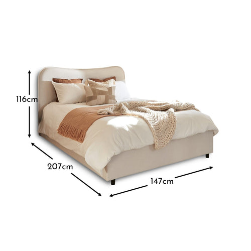 The Finola double ottoman bed is upholstered in a soft brushed weave fabric in an ivory hue and features a subtly curved headboard for a contemporary look. Its ottoman feature has a soft-close mechanism for safe, accessible storage, making it a practical and elegant addition to your bedroom.