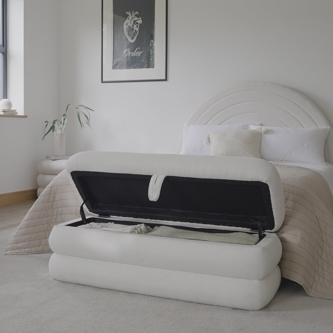 The Fleur large ottoman footstool is a statement piece that will elevate any bedroom or living room this season. Finished in chalk white boucle, the soft rectangular shaped Fleur footstool features a curved ribbed design with internal storage, soft close lid and an upholstered pull handle. This stool is ideal for a living room addition, ideal for storing magazines or throw blankets. Alternatively, elevate your bedroom with the Fleur for a fun and stylish look.