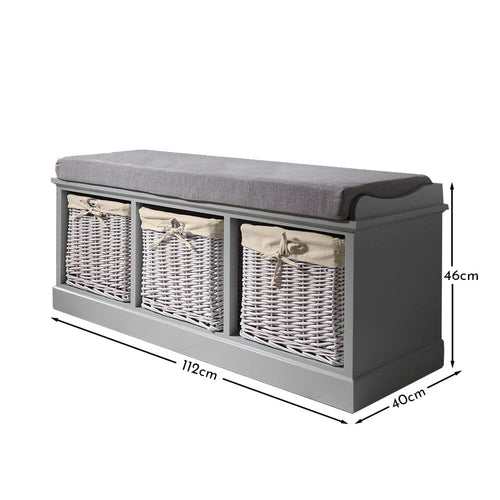 This hallway hero will help keep your entryway tidy with ease. In a stunning painted grey, this hallway bench is the ideal storage solution for your home. Complete with three wicker storage baskets that are perfect for keeping shoes, hats, gloves and small umbrellas organised.