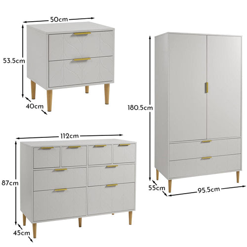 • Set includes - 1x bedside table, 1x 4 over 4 chest of drawers, 1x double wardrobe.