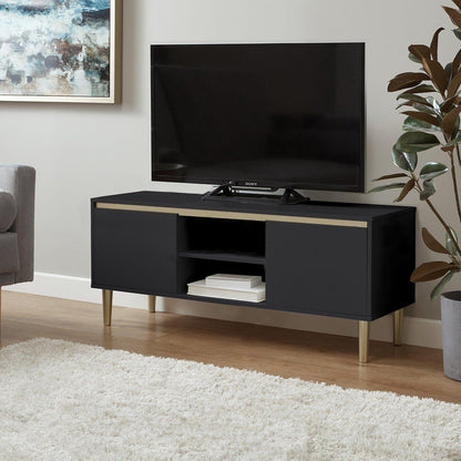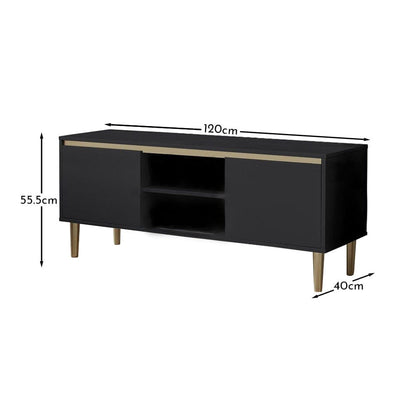 Love your living space with the Iliana charcoal grey TV unit. Finished in a dark and dreamy grey this TV unit is finished with brass accents and legs for an Art Deco twist. Featuring two cupboards, a shelving section and 2 cable management holes, this TV stand will help to keep your living room tidy and organised.