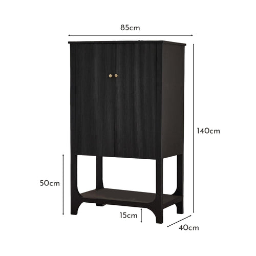 The Jade tall cabinet is finished in jet black and crafted in solid acacia wood, featuring 2 doors with a stylish fluted finish for texture and gold handles. The tall cabinet also features an open shelf underneath the cupboard. The curved edges are simple yet an unexpected design feature of this elegant cabinet.