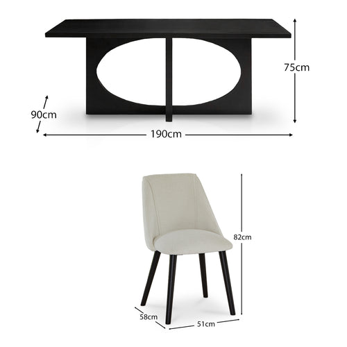 The Jade and Freya dining set will instantly elevate your home. The jet-black Jade rectangular dining table is made from durable acacia wood and features a large oval cut out design in the base of the table. With plenty of space for seating the Jade table is paired with 6 Freya dining chairs each finished in stylish ecru boucle for a textured look with black legs.