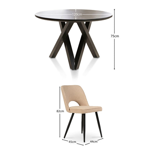 The Levi and Dolly 4-seater dining set includes the Levi black round dining table, crafted with an acacia wood tabletop and metal crossover legs for a modern look. It’s paired with four Dolly dining chairs, upholstered in natural boucle fabric with black legs, featuring a chic cut-out back detail to complete the look.
