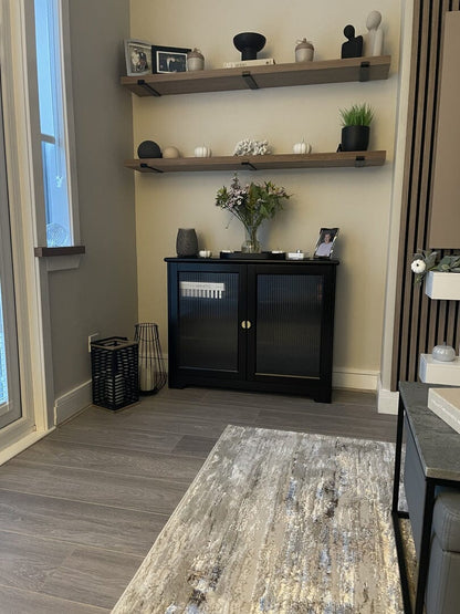 The Lua narrow sideboard features a sleek and modern design finished in noir black with beautiful, fluted glass panel doors. The double door front also features gold moon style door handles and there are three shelves inside for ample storage.