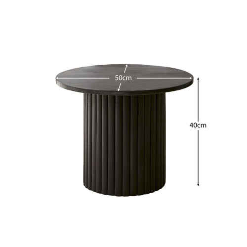 The Myla round side table from Laura James features a round real marble tabletop and round fluted column base. Finished in jet black, the base is crafted from solid mango wood, known for its density, strength, and durability with a find grain to add character to each piece.