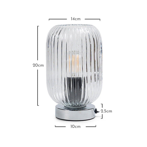 Experience the enchanting allure of the Ellan fluted clear glass table lamp. Its elegantly curved ribbed glass design beautifully diffuses light, while the sleek chrome base adds a modern touch.