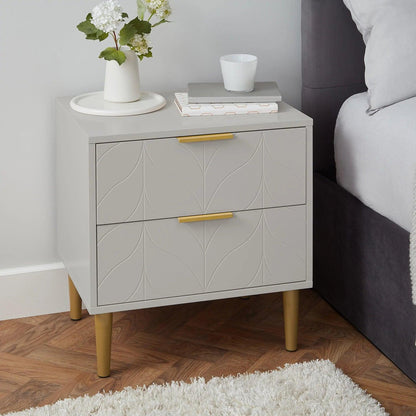 Transform your bedroom into an art deco haven with our Gloria bedside table. Featuring intricate carved detailing and brass effect handles and legs, this grey bedside table will be a chic addition to your room.