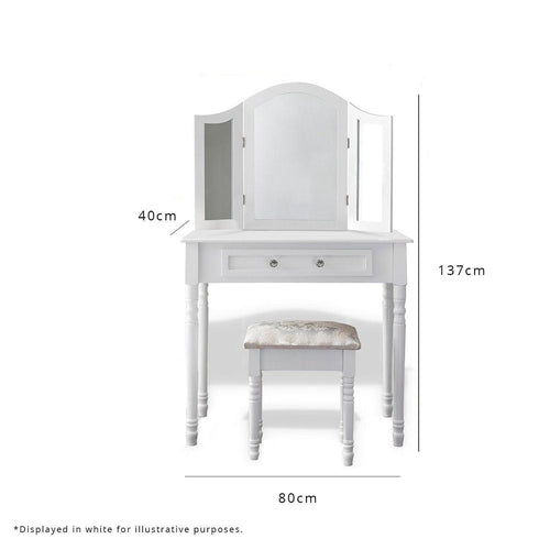 This vanity table features a tri-fold mirror making makeup application and hairstyling easier. Complete with a matching wooden stool, this is the perfect place to get ready in the morning.