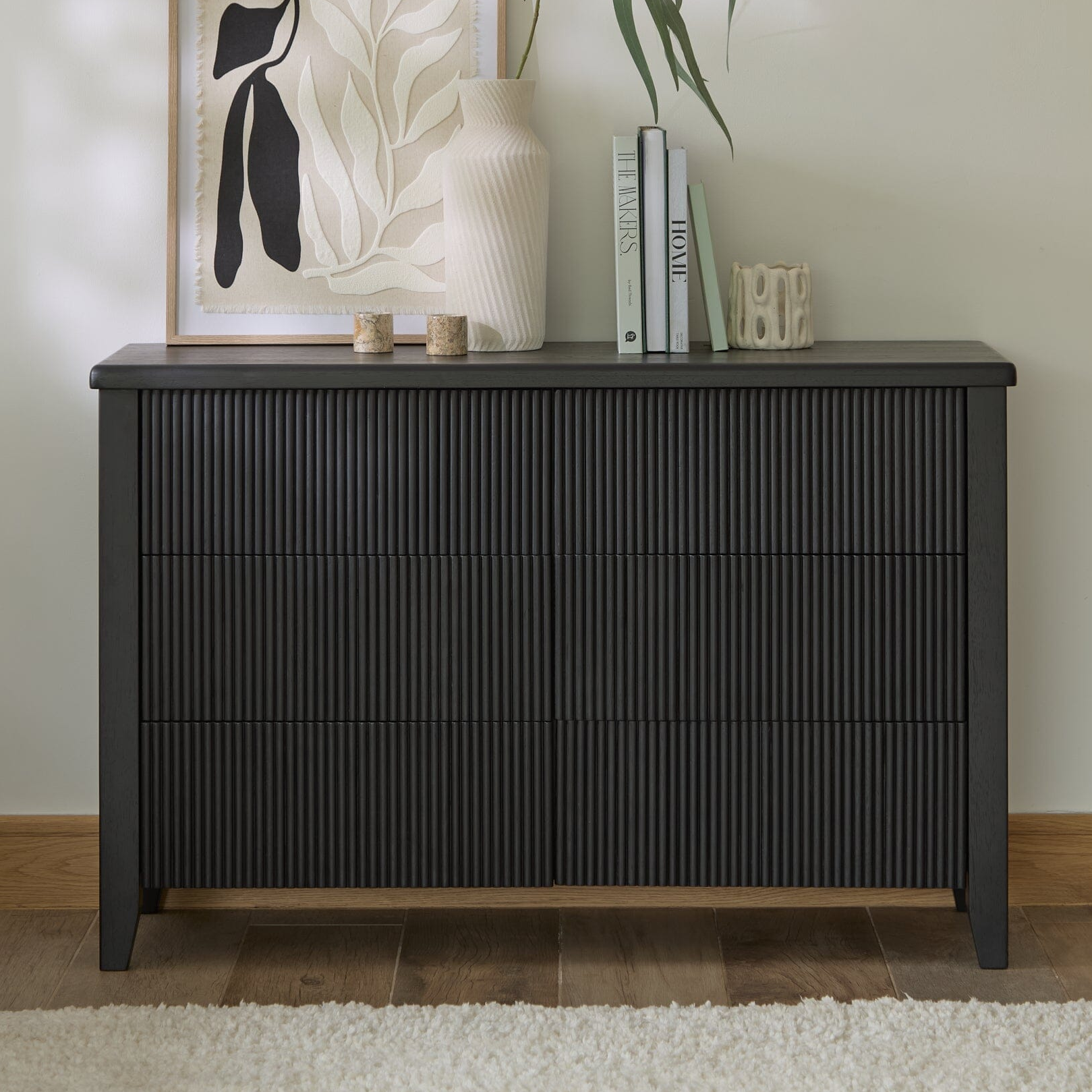 The Raleigh set of chest of drawers features six drawers for storage and is finished in black oak for a chic look. The Raleigh drawers feature a fluted finish for a stylish textured look, minimal handleless design and push to open function.