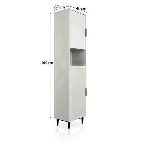 The Reva tallboy cabinet from Laura James features a storage cupboard at the top and bottom with an open shelf in the middle of the unit. This narrow unit is designed to fit in smaller bathrooms offering maximum storage. Finished in snow white with a subtle textured pattern and black handles and legs.