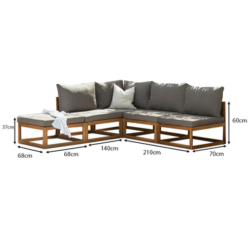 Crafted for comfort and enduring durability, the Rowan 5 seater set features a natural warm acacia wood frame, renowned for its strength and distinctive grain patterns. Sourced from acacia trees in Africa, Australia, and parts of Asia, this set adds an exotic touch to your garden. The weather-resistant outdoor sofa cushions, in a serene grey colour, can be effortlessly removed for convenient maintenance and washing, ensuring your garden set stays in pristine condition.