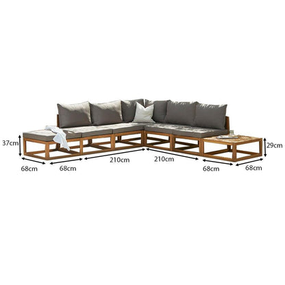 6 Seater Wooden Garden Chaise Corner Sofa Set with Coffee Table - Grey