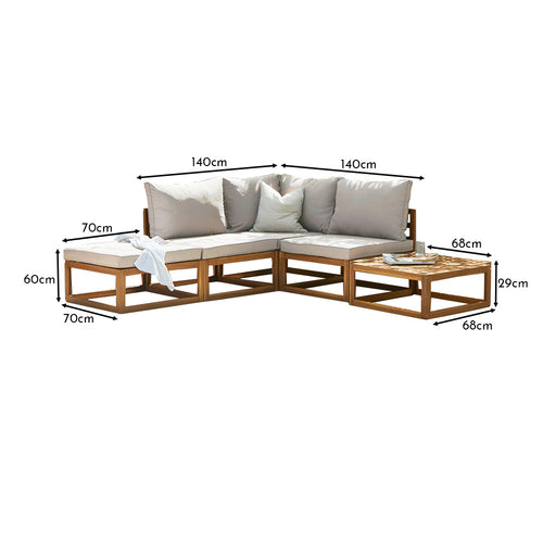 Create a serene and inviting corner in your garden with the Rowan sofa set, footstool, and coffee table. Indulge in leisurely mornings with a cup of coffee, immersing yourself in the soft and inviting cushions while enjoying your favorite read. For weekend BBQs or summer evenings, invite friends to gather around this stylish and functional ensemble. The harmonious blend of natural hues and acacia wood will complement any garden setting, whether nestled in a country garden or basking in the sun on your patio or terrace. Elevate your outdoor experience with the Rowan 4-Seater Corner Garden Sofa Set, a perfect amalgamation of comfort, style, and durability.