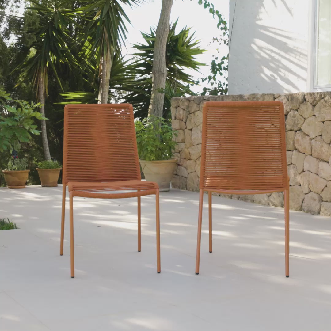 The Ryder dining chairs in burnt orange feature a powder-coated steel frame with colour matched woven rope seat and back ensuring a unique and stylish look. Both stylish and practical this set of 2 Ryder chairs can be stacked allowing them to be easily stored when not in use.