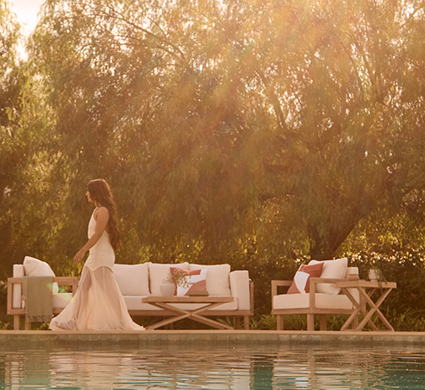 Add some personality to your garden this summer with the Saffron dining chairs. New for 2026 the Saffron dining dining chairs feature a solid acacia wood frame and statement woven geometric pattern in paprika and beige rope creating a statement look.