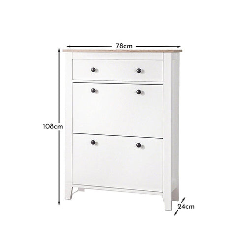 This white painted wooden shoe cabinet with an oak effect top is the perfect solution for keeping your entryway clean and tidy - and helps to keep your shoes in perfect condition. With two storage compartments and an added drawer, it has plenty of space to house your belongings.